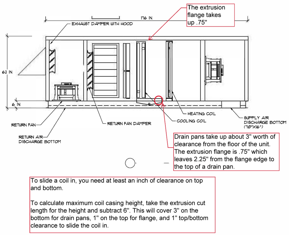 To slide a coil in, you need at least an inch of clearance on top and bottom. To calculate maximum coil casing height, take the extrusion cut length for the height and subtract 6″. This will cover 3″ on the bottom for drain pans, 1″ on the top for flange, and 1″ top/bottom clearance to slide the coil in.