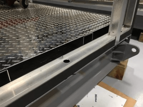 Bolting the enclosure frame to the base frame is the most common method of attachment. Drill a pilot hole through all surfaces followed by drilling the desired hole size for the diameter of the bolt to be used to secure the enclosure frame to the base frame. Once complete, drill a hole large enough to fit the correct socket through the top surface of the frame to access the bolt head as depicted below. You can place omega intermediate supports over the holes to conceal them as shown in the bottom right picture.